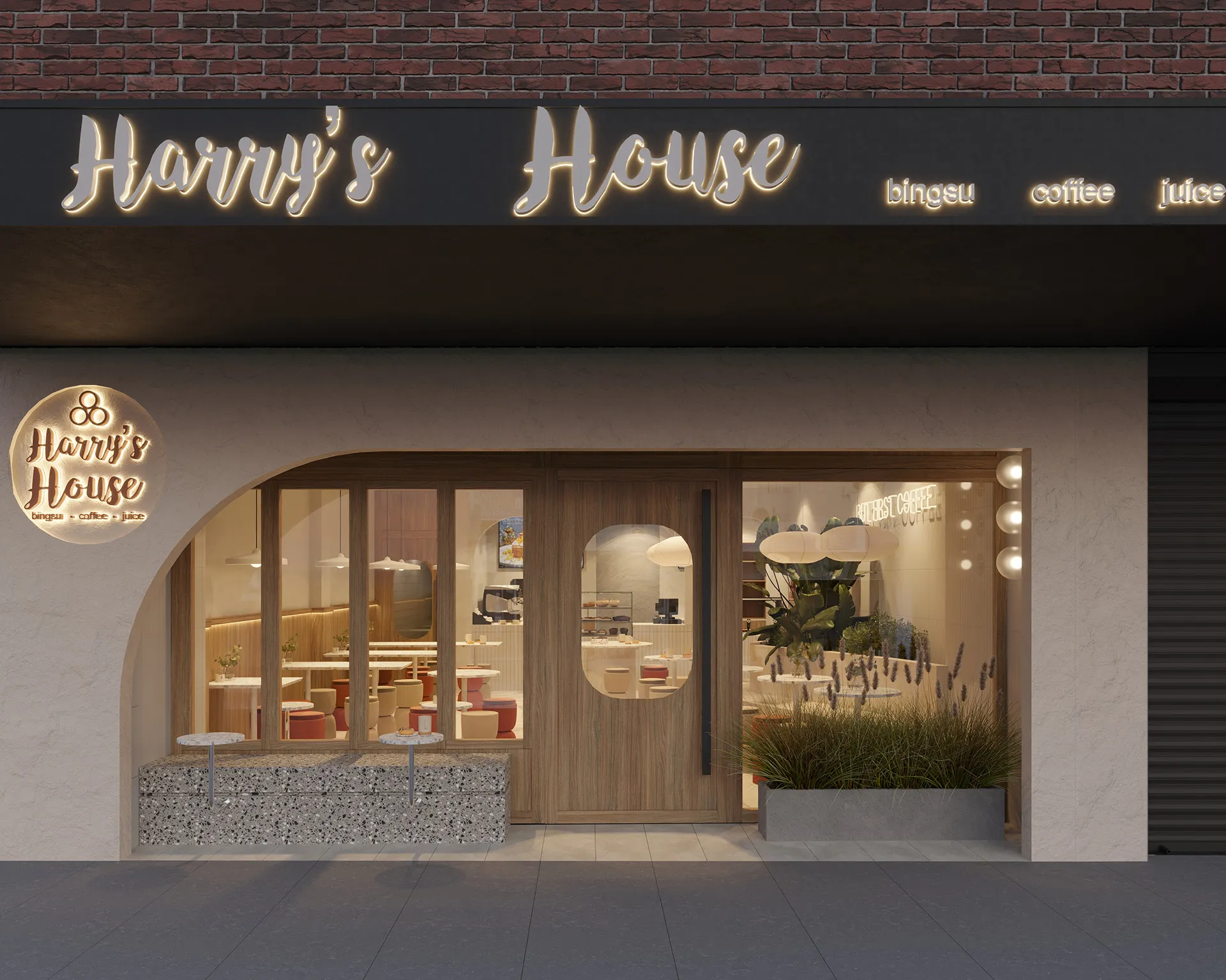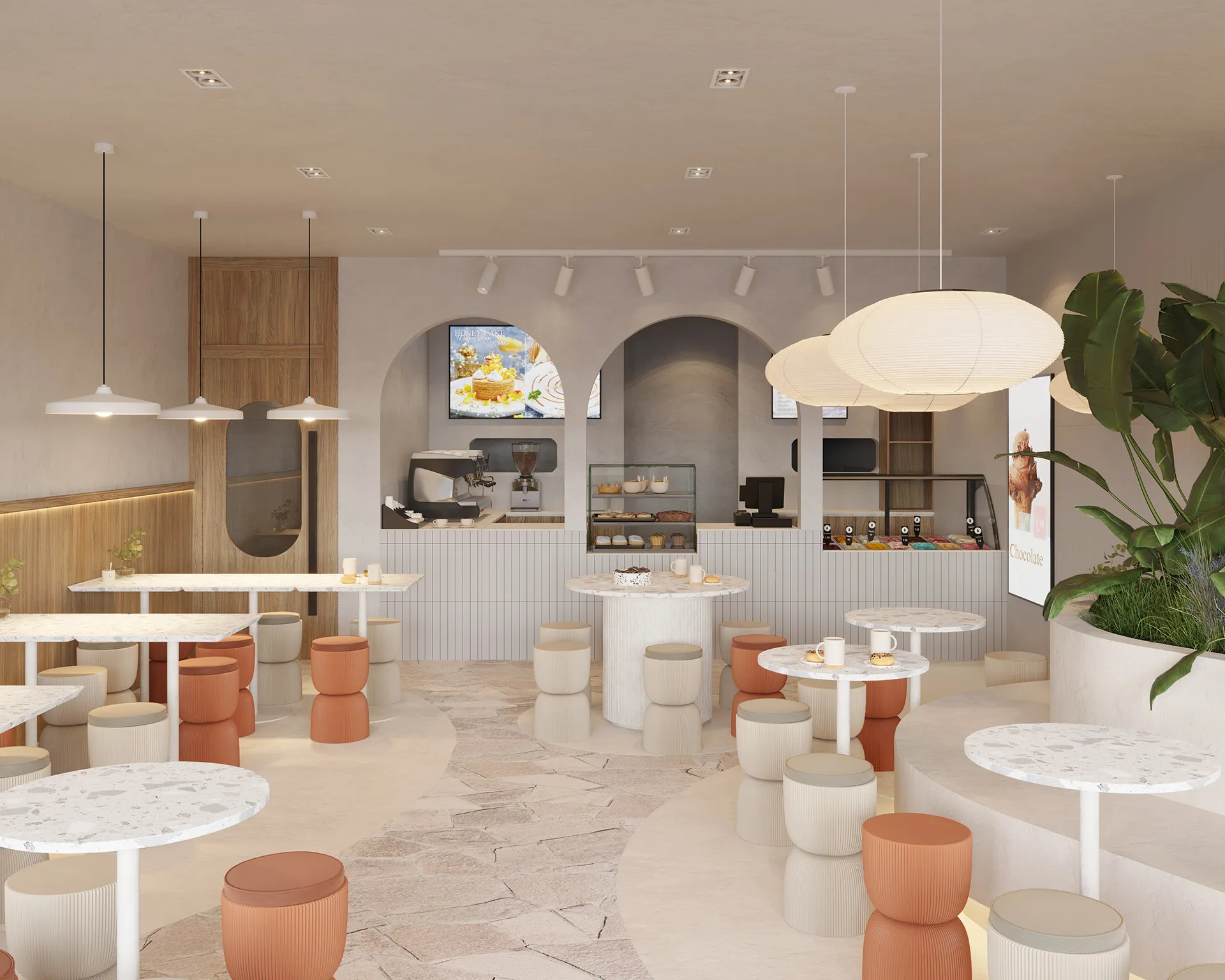 Our design featured a natural wood grain texture facade, combined with a textured render shopfront and green plants. Soft and inviting curved elements throughout the space brought to life a cozy and welcoming environment that was perfect for sitting back, relaxing, and enjoying the delicious dessert treats on offer.